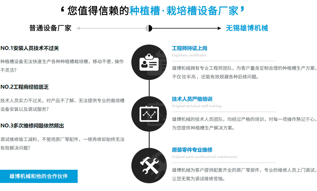 您在選擇雄博產(chǎn)品的同時,也選擇無微不至的終身服務(wù)。可根據(jù)不同客戶實際需求進(jìn)行種植槽設(shè)備,栽培槽設(shè)備等的特殊工藝設(shè)計制造專業(yè)一對一售前/售后/技術(shù)咨詢指導(dǎo),享受更貼心/放心的設(shè)備使用體驗。